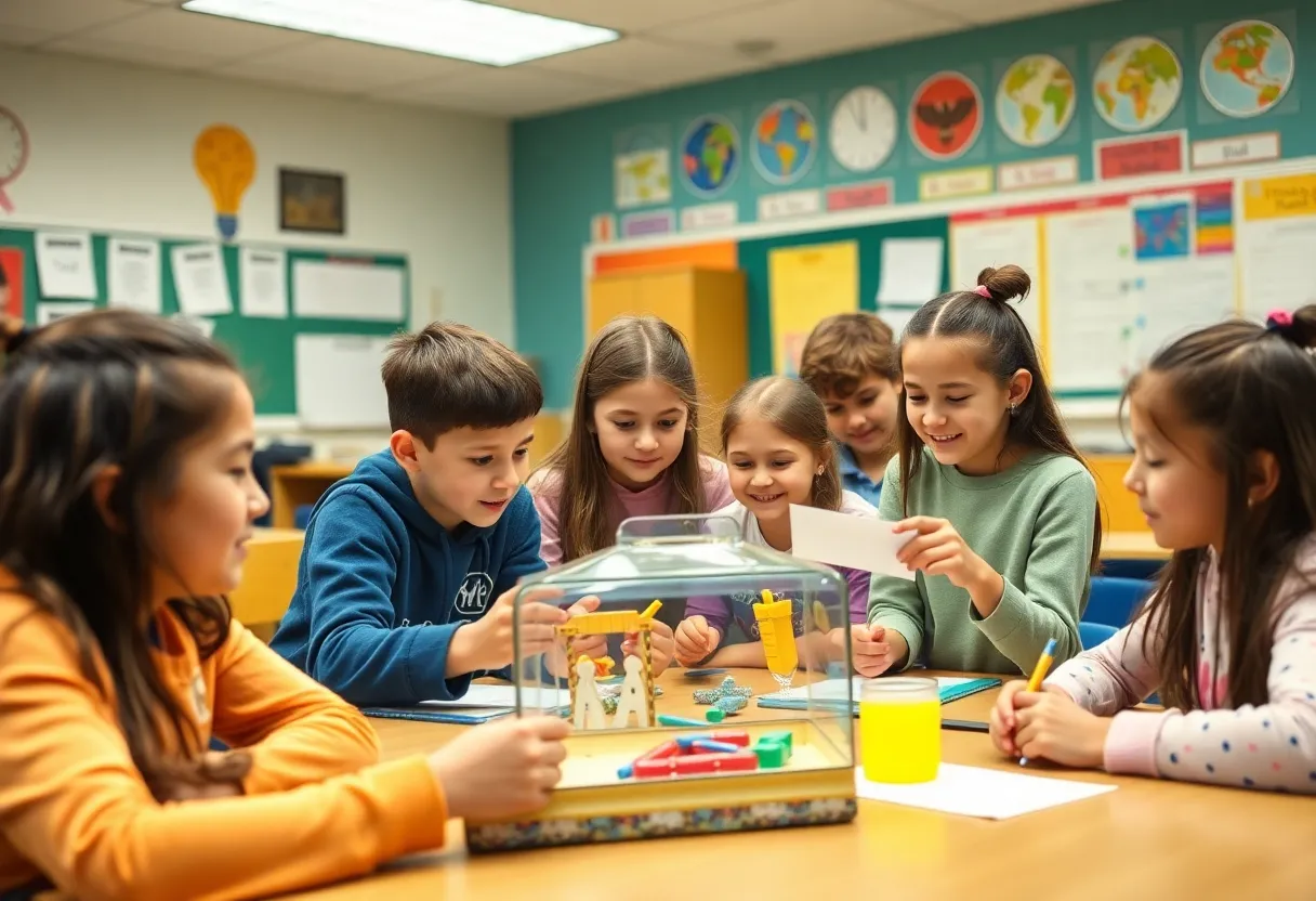 Students engaged in a learning activity in a colorful classroom