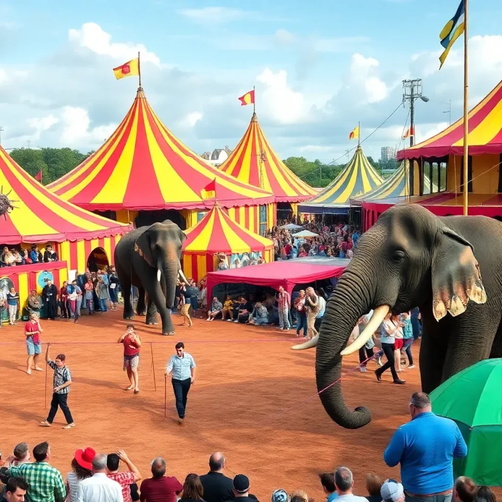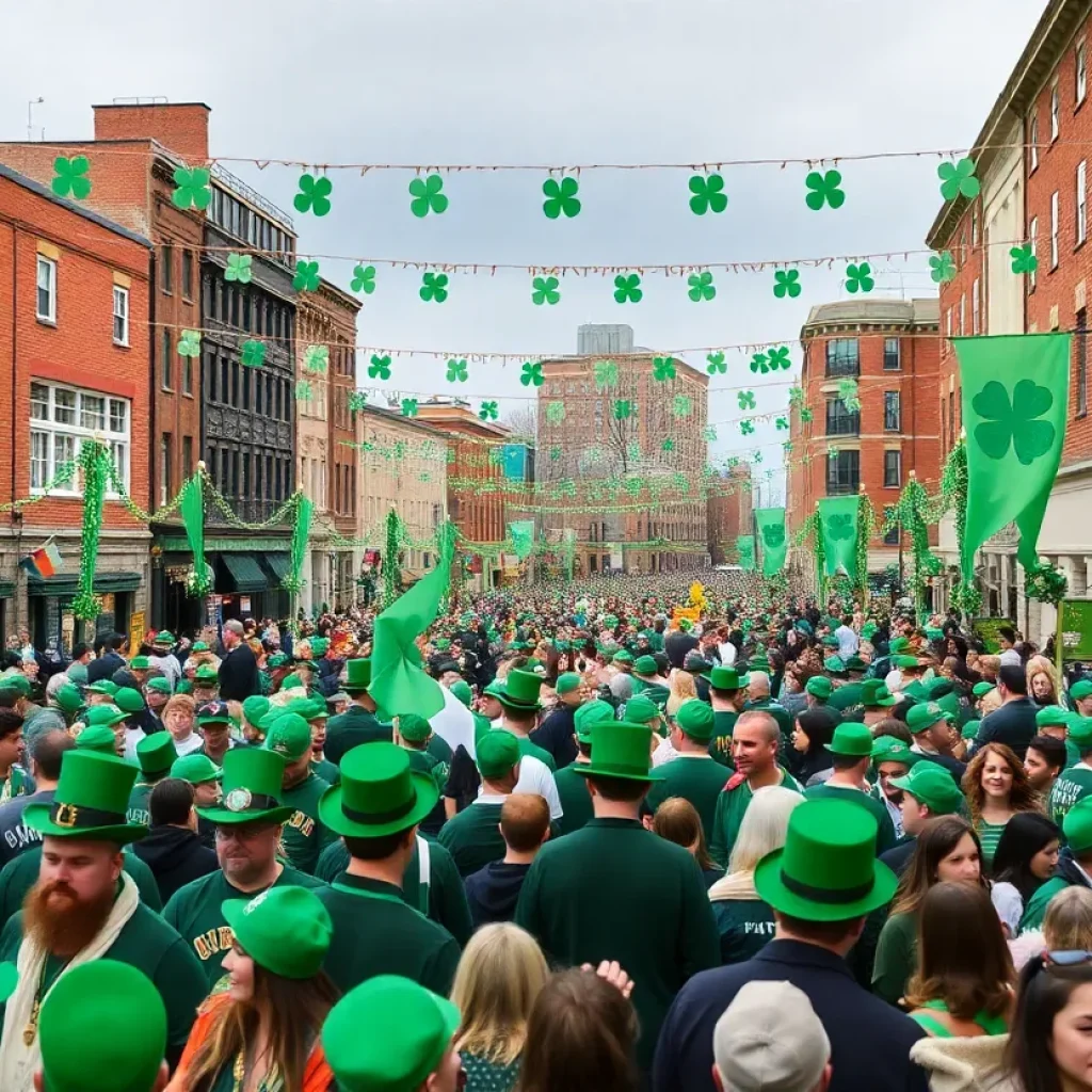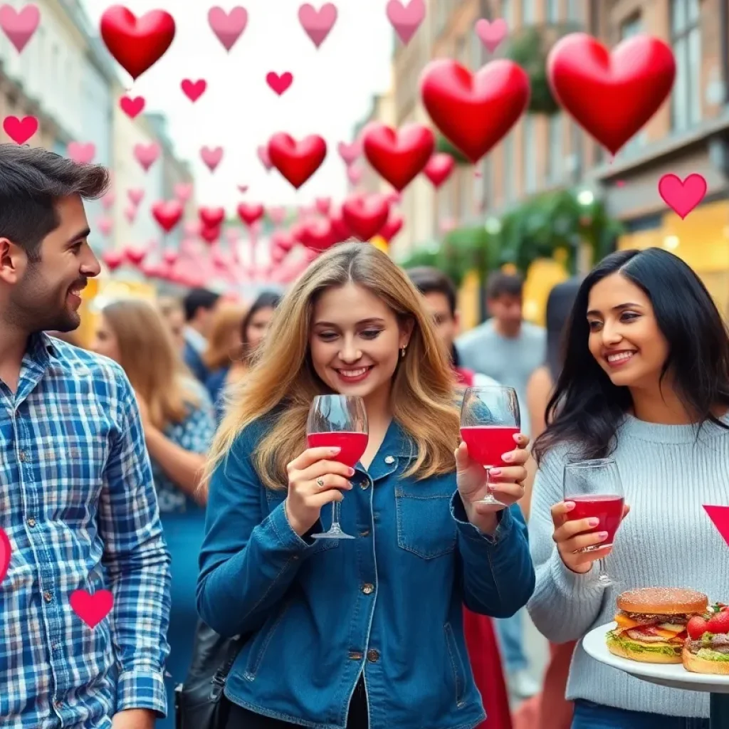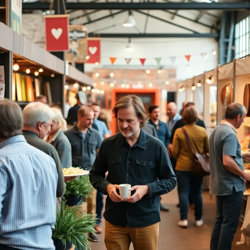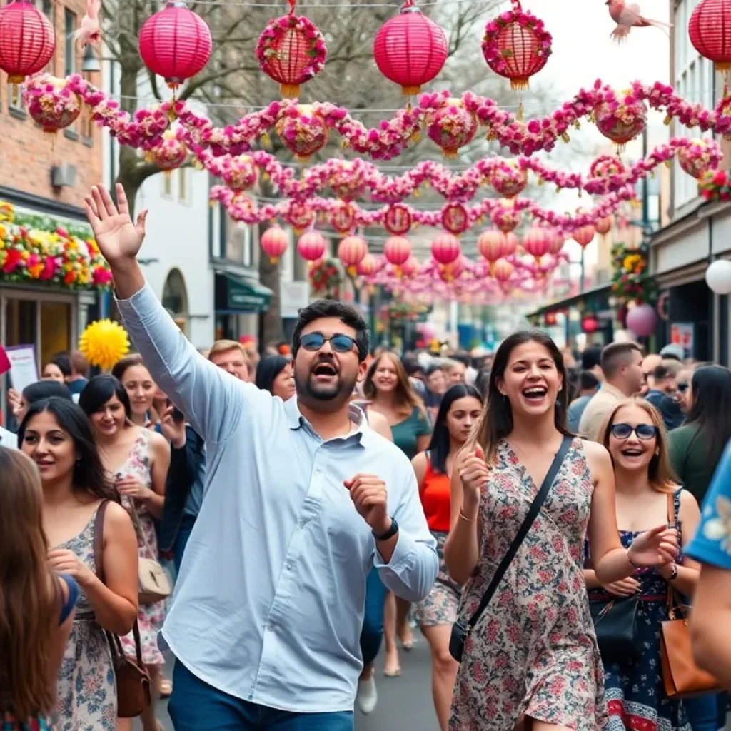 A bustling community festival in Birmingham with colorful decorations and food vendors.